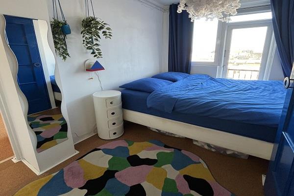 Slaapkamer: De ruime slaapkamer is een rustpunt in huis, uitgevoerd in frisse blauwtinten. Er is veel bergruimte dankzij de slimme inbouwkasten/garderobeoplossing.