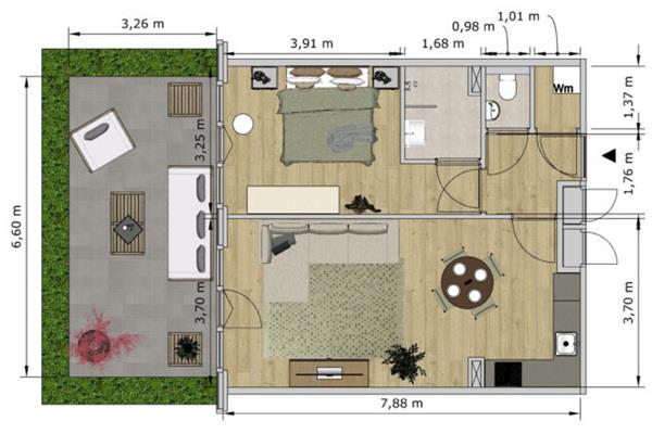 Vanuit de hal bereik je de royale slaapkamer. Daarnaast bereik je vanuit de hal de badkamer, voorzien van een douche, wastafel en spiegel. Het separate toilet is voorzien van een vrij hangend toilet en een fonteintje.