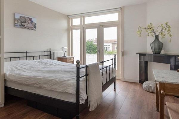 Overloop voorzien van modern toilet. Zonnige woonkamer en suite met schuifseparatie met houtkachel en erker aan de voorzijde met uitzicht op de kade. Erker is voorzien van bamboe vouwgordijnen.