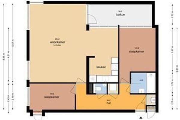 Entree en hal, lichte ruime woonkamer met beukenhouten vloer en met toegang tot balkon, half open keuken voorzien van inbouwapparatuur, badkamer met inloopdouche en wastafel, 2 slaapkamers, separaat toilet.