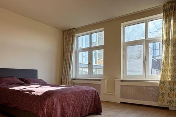 Hoofdslaapkamer met tweepersoonsbed, kledingkast en serene uitzicht over de charmante binnentuinen van Amsterdam.