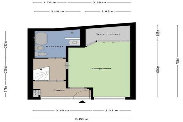 Entree op straat niveau, voor het huis staat een bankje om van het uitzicht te genieten. Tochtportaal, gang. De gang geeft toegang tot de slaapkamer, badkamer en klassieke steile trap. De slaapkamer is licht, ruime en heeft via en-suite deuren toegang tot de inloopkast.