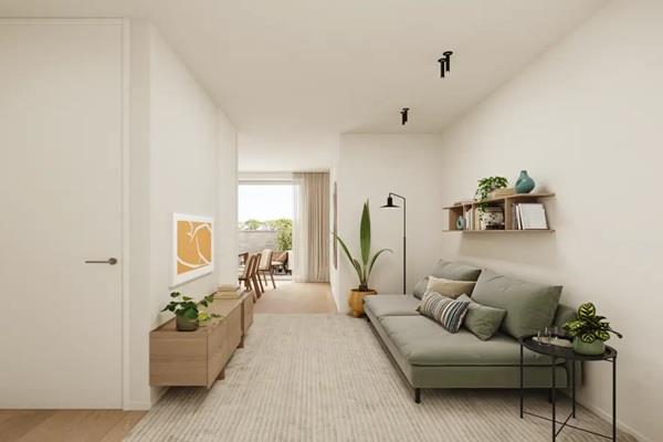 -Woonkamer met open keuken en toegang tot balkon met fraai uitzicht over het binnenterrein