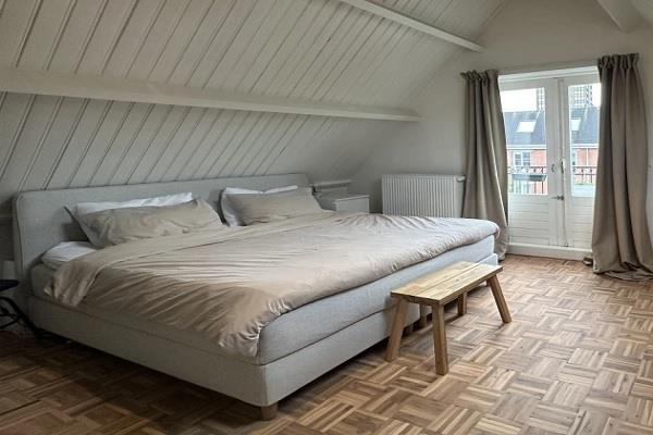 Aan de achterzijde bevindt zich de hoofdslaapkamer met tweepersoonsbed, ruime kastenwand en een vrijstaand bad, met toegang tot het balkon. De tweede slaapkamer ligt aan de voorzijde en is ingericht met een bureau, fauteuil en eenpersoonsbed. De derde kamer is ingericht als werkkamer met ladekasten en een ruim bureau.