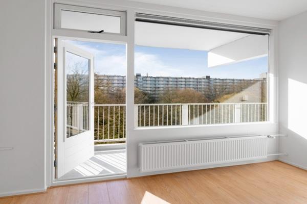 Het appartement bevindt zich op de vijfde verdieping en beschikt over een ruime, lichte woonkamer met veel daglicht en een zonnig balkon op het zuiden. De halfopen keuken is voorzien van een bar en uitgerust met onder andere een vaatwasser, oven, magnetron, kookplaat, koelkast en voldoende kastruimte. Aangrenzend bevindt zich een praktische bijkeuken met aansluiting voor de wasmachine.