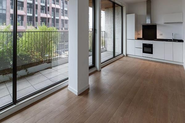 Via het gezamenlijke trappenhuis kom je bij de entree op de eerste verdieping. In de hal kun je meteen alle ruimtes in. De woonkamer heeft grote ramen aan de voorzijde, waardoor het lekker licht is. Er is genoeg plek voor een zit- en eethoek. De open keuken is voorzien van inbouwapparatuur en netjes afgewerkt, prettig voor wie graag kookt.