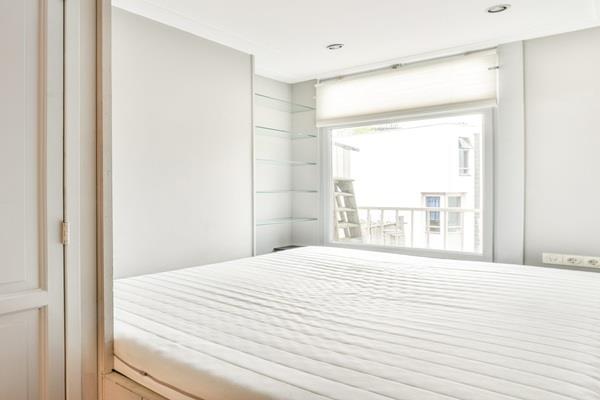 Aan de achterzijde de open keuken en tweede balkon. De slaapkamer bestaat uit een ingebouwd tweepersoonsbed met planken.