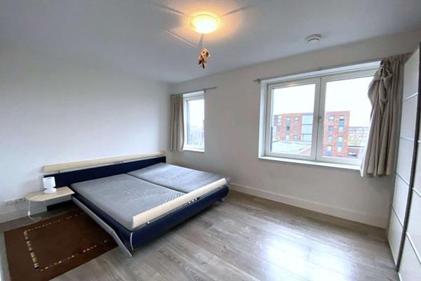 Badkamer met bad, douche en wastafel, er zijn luxe materialen gebruikt. Twee ruime slaapkamers.