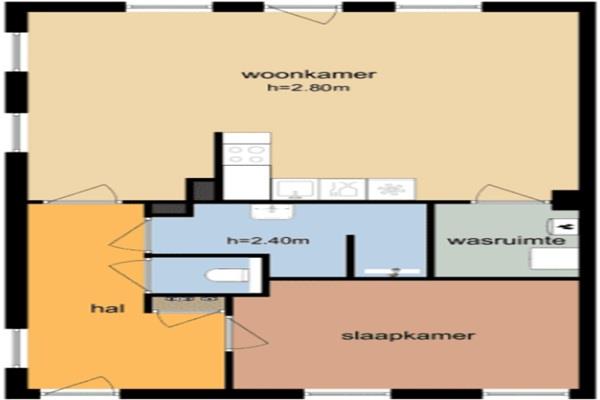 Dit 2 kamer appartement is gelegen op de vierde etage. Bij binnenkomst kom je in de hal, hier bevind zich het toilet, vanuit de hal loop je naar de woonkamer met open keuken voorzien van inbouwapparatuur (koelkast, kookplaat, afzuigkap en combimagnetron). De keuken biedt toegang tot de wasruimte. Vanuit de woonkamer heb je toegang naar je slaapkamer, de badkamer is voorzien van inloopdouche en wastafel.