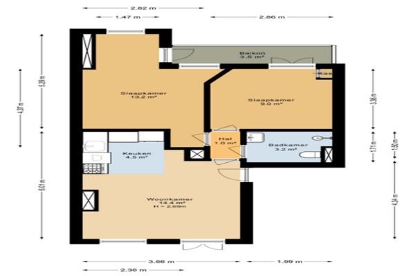 Je komt via het trappenhuis binnen in het appartement waar je meteen in de woonkamer staat. De wonkamer heeft een goede lichtinval en een Frans balkon. De open keuken is voorzien van diverse inbouwapparatuur zoals een koelkast, combi-magnetron, vaatwasser, gaskookplaat en een afzuigkap.. Via de hal kom je in de badkamer welke voorzien is van een douche, wastafel, toilet en handdoekradiator. Aan de achterzijde zijn twee slaapkamers gelegen welke beide toegang geven tot het balkon welke gelegen is op het noordoosten.