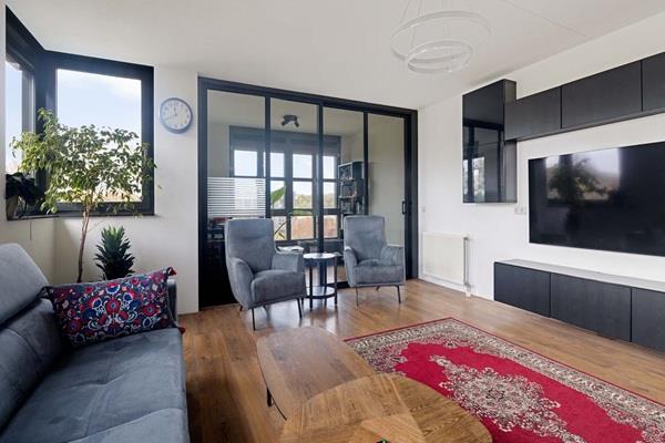 Het appartement beschikt over veel natuurlijke lichtinval en bevindt zich op de bovenste verdieping. Het heeft twee keer zoveel ramen vergeleken met vergelijkbare appartementen in het gebouw, waarbij het licht van drie kanten komt (zuid, west en noord), wat een penthouse-achtig gevoel geeft. De ruime woonkamer sluit naadloos aan op een goed uitgeruste keuken, perfect om dagelijks te koken en dineren. Er zijn twee comfortabele slaapkamers en een extra kantoorruimte, die volledig geïsoleerd en geluiddicht is, ideaal voor thuiswerken.