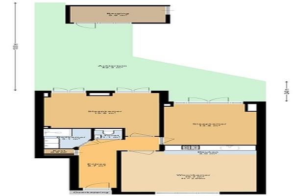 Beide slaapkamers zijn zeer ruim en grenzen aan de tuin van het huis die ook een royale afmeting heeft. Achterin de tuin is een berging. De douche bevindt zich aan de linkerkant van het huis en heeft twee wastafels en ruimte voor een wasmachine en droger. Er is een separate toilet.