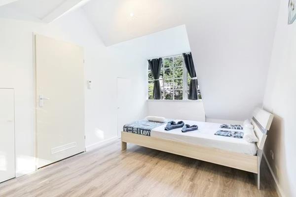 Via de trap bereik je de ruime en verzorgde slaapkamer op de verdieping. Deze beschikt over een en-suite badkamer, uitgerust met een regendouche, wastafel en handdoekradiator.