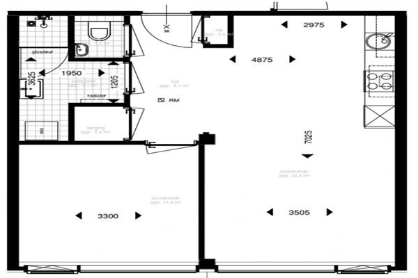 Ruime hal, toilet met fonteintje, berging, woonkamer met open moderne keuken die is voorzien van een koel-vriescombinatie, inductiekookplaat, RVS afzuigkap, vaatwasser en combi-ovenmagnetron. De slaapkamer is 12m² groot. De moderne badkamer is voorzien van een douche, wastafelmeubel en een design radiator.