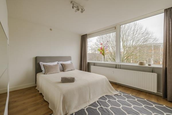 Entree appartement, ruime hal, ruime en lichte woonkamer met aan beide zijde een balkon, dichte keuken voorzien van diverse inbouw apparatuur. Twee slaapkamers van vrijwel gelijkwaardig formaat en zeer ruim (circa 16 m2). Beide slaapkamers bieden toegang tot een van de twee balkons. De badkamer beschikt over een dubbele wastafel, douche en wasmachineaansluiting. Er is een separaat toilet en in de hal zijn inbouwkasten.