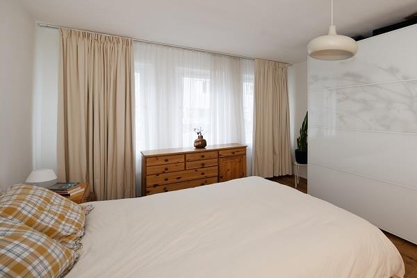 De woning heeft twee slaapkamers. De grote slaapkamer is voorzien van een tweepersoonsbed en een ruime garderobekast. De tweede slaapkamer, gelegen tussen de woonkamer en de keuken, beschikt over een slaapbank en kan perfect dienen als logeerkamer of werkkamer. De badkamer is uitgerust met een inloopdouche, een toilet en een wastafel.