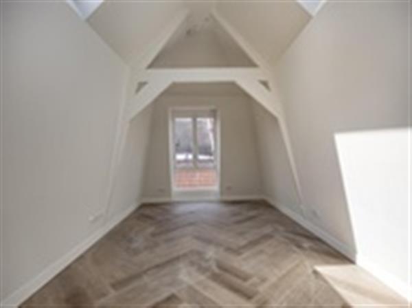 De lichte woonkamer met open keuken vormt het hart van het appartement. Dankzij de hoge plafonds, zichtbare balkconstructies en meerdere dakramen geniet de ruimte van een bijzonder ruimtelijk gevoel en een prachtige lichtinval. De moderne open keuken is strak uitgevoerd en voorzien van hoogwaardige inbouwapparatuur, ideaal voor dagelijks gebruik en het ontvangen van gasten.