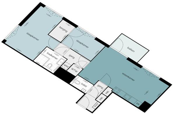 De keuken en badkamer zijn volledig ingericht. De keuken is uitgerust met een inductie kookplaat, afzuigkap, een ingebouwde koelkast met vriesvak en een geïntegreerde vaatwasser – superhandig! Er zijn twee slaapkamers voorzien van grote ramen. De badkamer is voorzien van douche, wastafel en toilet. Ook is er een aparte ruime berging in de woning en een aparte plek voor de wasmachine.