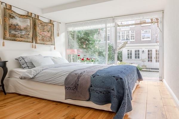 Aan de achterzijde ligt de rustige, zonnige slaapkamer met een schuifpui naar de heerlijke tuin op het zuiden. In de tuin staat een tuinhuis met aansluiting elektra en er is verwarming, een fantastische plek om te werken/studeren of voor logees. In de kelder is er nog extra bergruimte.