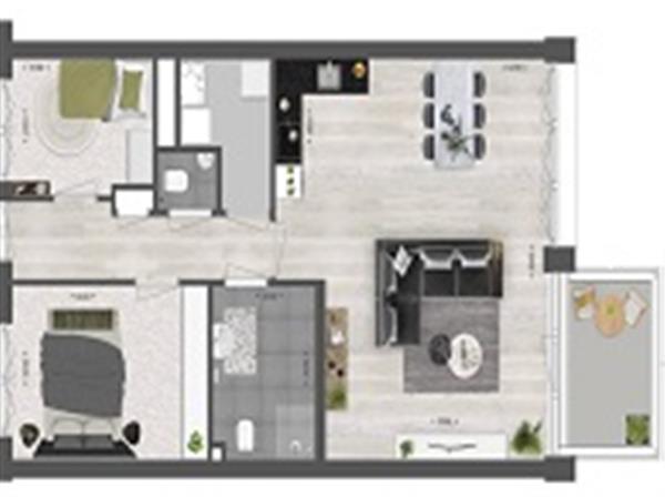 Dit appartement is ruim en baadt in natuurlijk licht dankzij de grote, kamerhoge glazen gevel. De lichte woonkamer geeft toegang tot een ruim balkon aan de zonnige kant van het gebouw. De open keuken is voorzien van inbouwapparatuur. Er zijn twee slaapkamers. De ruime badkamer beschikt over een inloopdouche met glazen douchewand, een wastafel en een hangend toilet.