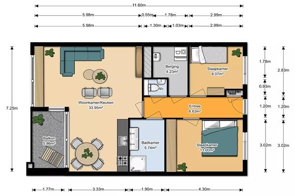 De woning bestaat uit drie kamers waarvan twee slaapkamers en een woonkamer met open keuken en toegang tot het balkon. De eigentijdse keuken is voorzien van inbouwapparatuur. Daarnaast is er een badkamer met douche en dubbele wastafel en een apart toilet te vinden in de woning.