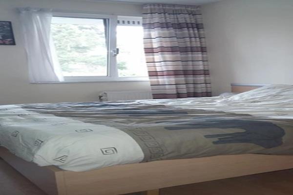 Een slaapkamer met kastenwand. De badkamer is ruim opgezet en voorzien van douche, toilet, dubbele wastafel en wasmachine-/drogeraansluiting. Tevens is er een berging voor het stallen van een fiets en een eigen parkeerplaats.