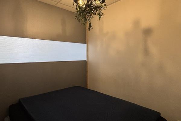 De slaapkamer ligt centraal in de woning en is rustig gesitueerd. Aan de achterzijde vind je de badkamer met douche en wastafel.