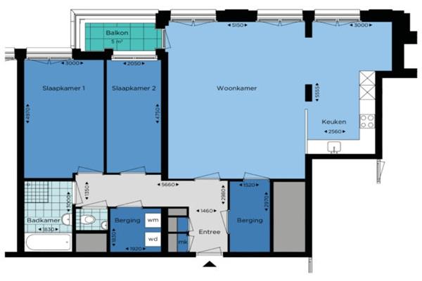 In de hal vindt u de meterkast, berging en de toiletruimte. Vanuit de hal betreedt u de ruime woonkamer met open keuken en deur naar het balkon (westen). De keuken is voorzien van luxe Siemens inbouwapparatuur zoals een keramische kookplaat, afzuigkap, vaatwasser, combi oven en koel/vriescombinatie. De badkamer is voorzien van wastafel, douche en ligbad. Het appartement beschikt over 2 slaapkamers waarvan er één toegang heeft tot het balkon.