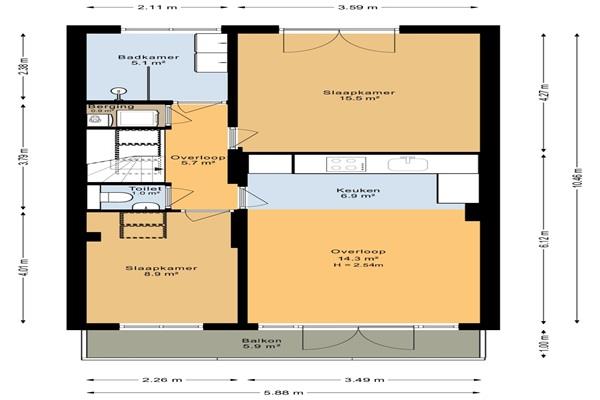 Het appartement ligt op de derde en tevens bovenste verdieping. Via een gedeelde entree kom je met de trap naar de derde verdieping. Je komt binnen in de hal welke toegang geeft tot alle ruimtes. In d ehal is een apart toilet met een fonteintje. De woonkamer met open keuken is licht en ruim. De keuken in voorzien van inbouwapparatuur zoals een koel-vries combinatie, gaskookplaat, combimagnteron, afzuigkap en een vaatwasser. Er zijn twee slaapkamers waardoor de woning ook geschikt is voor twee werkende delers. De badkamer heeft een douche, wastafel en een handoekradiator.