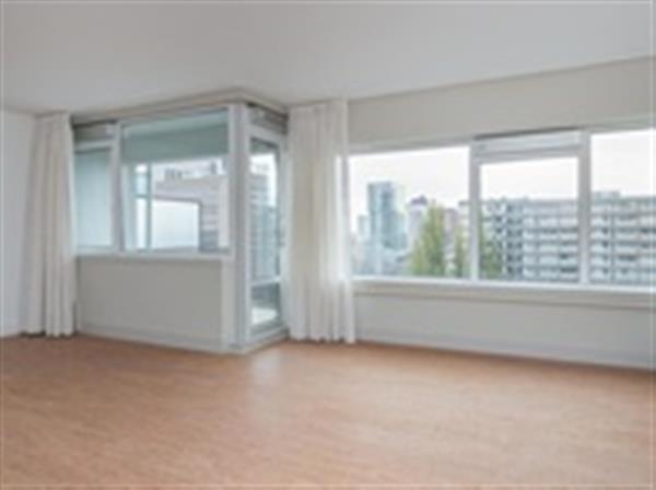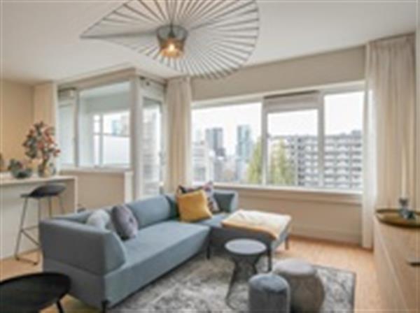 De ruime woonkamer met open keuken heeft een oppervlakte van ruim 38m2. De woonkamer is voorzien van fraaie armaturen en semi transparante gordijnen. Hierdoor heeft u een weids uitzicht over het centrum van Rotterdam. Tevens heeft u vanuit de woonkamer toegang tot het balkon van ruim 7m2.