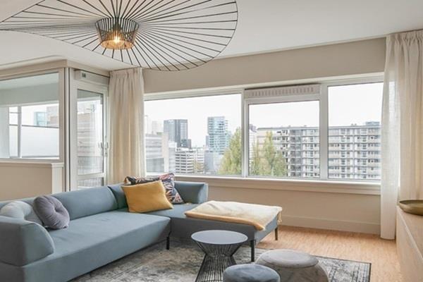 De ruime woonkamer met open keuken heeft een oppervlakte van ruim 38m2. De woonkamer is voorzien van fraaie armaturen en semi transparante gordijnen. Hierdoor heeft u een weids uitzicht over het centrum van Rotterdam. Tevens heeft u vanuit de woonkamer toegang tot het balkon van ruim 7m2.