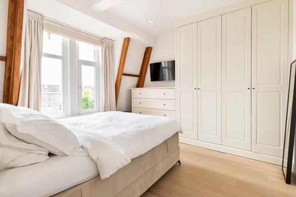 Slaapkamer: Grote slaapkamer met mooie houten balken, smart-tv (honderden kanalen + streamingdiensten) en airco. Vanuit de slaapkamer kijk je uit over het levendige Kwakersplein.