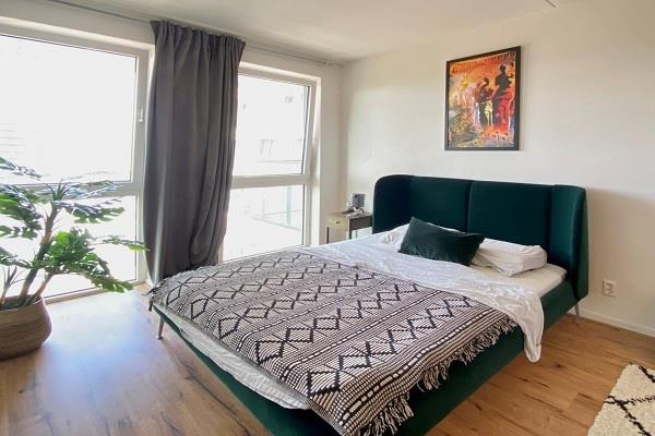 De lichte woonkamer met open keuken geeft toegang tot het ruime balkon.