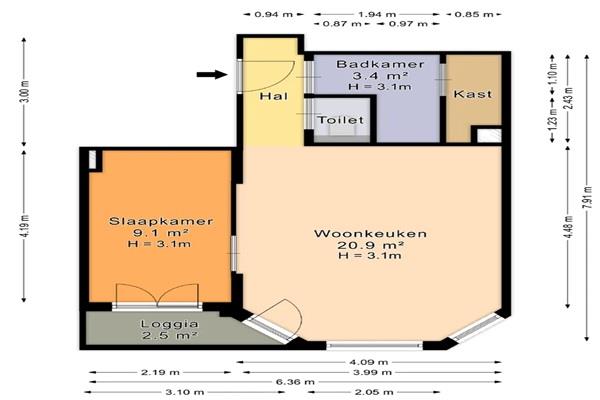 Entree op straat niveau, algemene voordeur. Trap naar de eerste etage. Voordeur appartement. Hal met toegang tot alle vetrekken. De woonkamer is gelegen aan de voorzijde van het appartement en is erg licht. Wat direct opvalt is de mooie erker, het balkon gelegen op het zuidwesten (bereikbaar via de woon- en slaapkamer), stijlvolle meubilering en de open keuken met composieten werkblad welke van alle gemakken is voorzien. Denk hierbij aan een luxe Quooker heetwaterkraan, een oven-magnetron combinatie van Siemens, een koelkast, vaatwasser en een inductiekookplaat met downdraft. De woning is verder voorzien van een visgraat PVC vloer en wordt verwarmd (en gekoeld!) middels een warmtepomp. Kortom, comfort in optima forma!