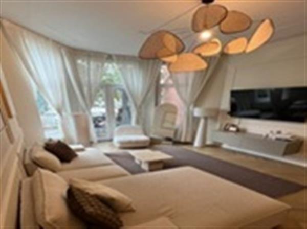Voortuin, gedeelde entree, voordeur appartement. De riante woonkamer ligt aan de voorzijde en heeft openslaande deuren naar de voortuin gelegen op het Zuidoosten en een nieuwe open keuken (in L-opstelling voorzien van 4-pits kookplaat, oven, koel-/vriescombinatie, vaatwasser en afzuigkap.) Deur naar de achtergelegen master bedroom met toegang tot de groene en diepe achtertuin met handige opbergschuur van steen.