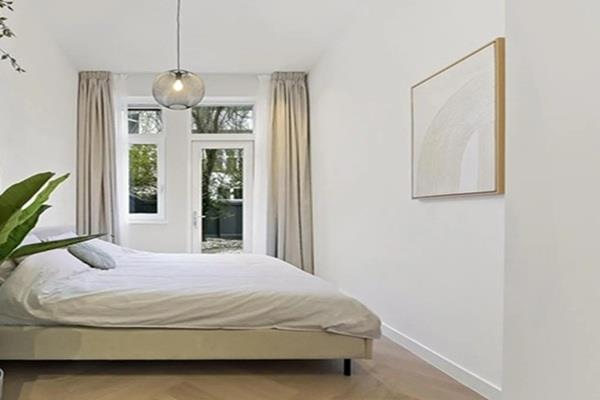 Terug in de hal hebben we aan de achterijde van het appartement nog de prettige slaapkamer welke is voorzien van een tweepersoonsbed, een handige kast en deur naar de tuin.