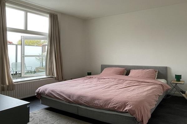 Het hoge plafond en de grote ramen vind je ook terug in de ruime slaapkamer. De badkamer is netjes afgewerkt met een meubel met ingebouwde wastafel en een inloop douche met glazen wand. Hier is tevens ruimte om je wasmachine te plaatsen.