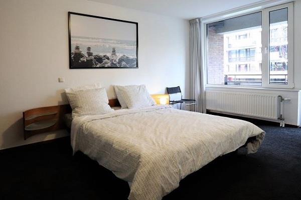 Ruime slaapkamer 1 met vloerbedekking, deur naar het balkon en vaste kastenwand.