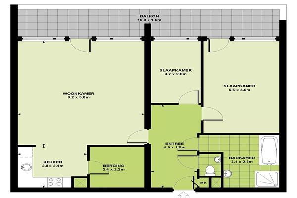 Je betreedt het appartement via de hal. De hal biedt toegang tot de woonkamer, de slaapkamers, de badkamer en een separate toiletruimte. Tevens bevindt zich hier een bergkast alwaar zich de unit van de stadsverwarming bevindt.