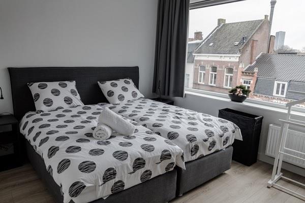Na de entree met apart toilet komt u in lichte en ruime woonkamer. Omdat het appartement op de hoek ligt, heeft het woongedeelte aan drie zijden ramen. De accommodatie is mede aantrekkelijk vanwege het minimalistische ontwerp. Het heeft een comfortabele zithoek met een luxe design bank en flatscreen-tv. Daarnaast is er gezellige eettafel vanwaar u de stijlvolle, volledig uitgeruste keuken kunt zien. Deze is voorzien van vaatwasser, oven en magnetron.