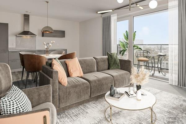 Het appartement heeft een lichte woonkamer van circa 35 m², welke beschikt over een moderne keuken welke uitgerust is met alle benodigde inbouwapparatuur. Vanuit de woonkamer is het terras van 6 m² te bereiken. Deze woning beschikt over twee slaapkamers waarvan één slaapkamer een oppervlakte heeft van circa 12 m² en de andere slaapkamer een oppervlakte van circa 10 m². Aan de andere kant van de gang bevinden zich de moderne badkamer met inloopdouche, wastafel met wastafelmeubel en het toilet. Daarnaast de inpandige berging met wasmachine- en drogeraansluiting.