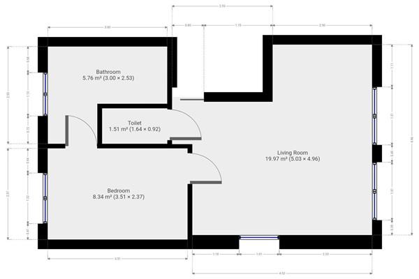 De slaapkamer bevindt zich aan de andere zijde van de woning. Ook deze ruimte is voorzien van een raampartij die te openen is. De badkamer is te bereiken via de slaapkamer. De badkamer is voorzien van een inloopdouche en een wastafel. Er is een aansluiting voor een wasmachine aanwezig.Het appartement beschikt tot slot over een separaat toilet.