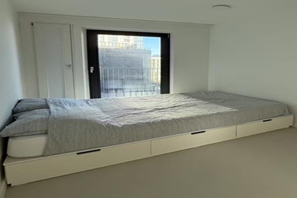 Slaapkamer: De slaapkamer is voorzien van een bed van 140 cm breed, stijlvolle gordijnen voor privacy en een ruime kledingkast. De grote ramen zorgen voor veel natuurlijk licht en creëren een aangename en rustgevende omgeving.
