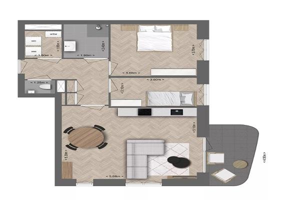Het appartement heeft twee ruime slaapkamers. Dat maakt het geschikt voor een stel, een klein gezin of iemand die simpelweg extra ruimte wil voor werk of hobby’s. De badkamer is netjes en voorzien van een douche en wastafel.
