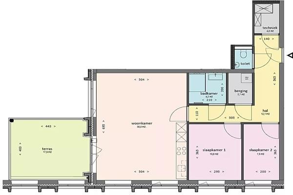 Het appartement beschikt over twee slaapkamers, beide goed van formaat en rustig gesitueerd. De moderne badkamer is voorzien van een inloopdouche en wastafel, daarnaast is er een apart toilet aanwezig. Voor extra comfort beschikt de woning over een interne berging en een praktische technische ruimte met aansluitingen voor wasapparatuur.