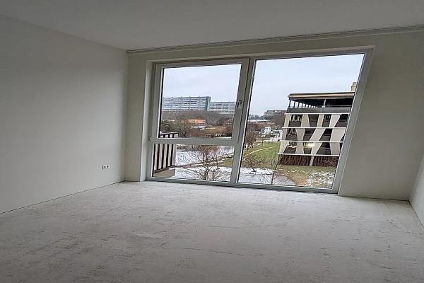 Dit appartement heeft een praktische indeling met twee slaapkamers, een woonkamer met open keuken, een badkamer, separate toiletruimte, berging en een buitenruimte van circa 6 m². De woonkamer en keuken vormen samen één open ruimte met daglichttoetreding via meerdere ramen en directe toegang tot de buitenruimte. De keuken is opgesteld langs de wand en voorzien van aansluitingen voor inbouwapparatuur.