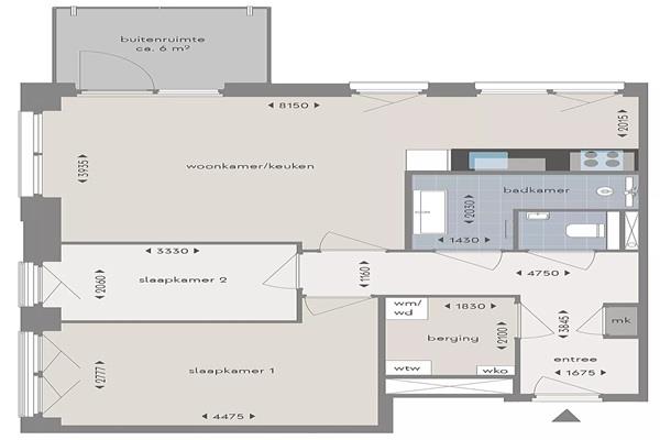 Dit appartement heeft een praktische indeling met twee slaapkamers, een woonkamer met open keuken, een badkamer, separate toiletruimte, berging en een buitenruimte van circa 6 m². De woonkamer en keuken vormen samen één open ruimte met daglichttoetreding via meerdere ramen en directe toegang tot de buitenruimte. De keuken is opgesteld langs de wand en voorzien van aansluitingen voor inbouwapparatuur.