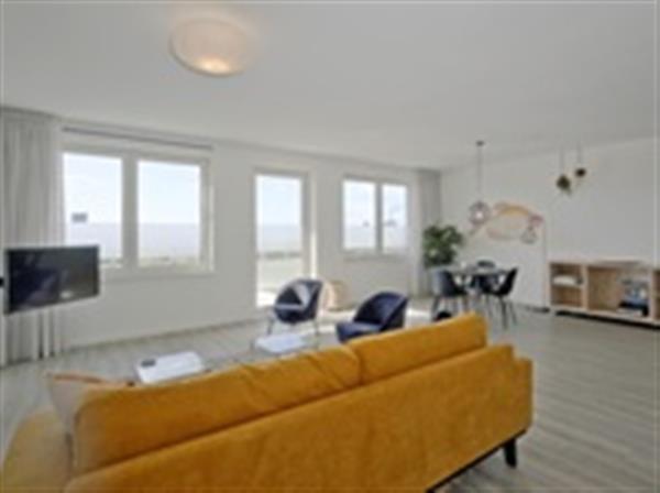 De ruime en brede woonkamer is het middelpunt van het appartement met een comfortabele grote bank, stoelen, dressoirkasten en een royale tv. Het appartement ademt vooral de ruimte in met zijn vrijstaande eethoek met 6 persoons eettafel, perfect als u thuis moet werken.
