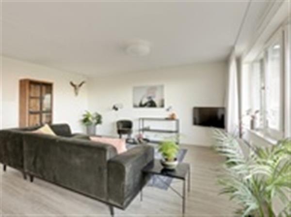 De ruime en brede woonkamer is het middelpunt van het appartement met een comfortabele grote bank, stoelen, dressoirkasten en een royale tv. Het appartement ademt vooral de ruimte in met zijn vrijstaande eethoek met 6 persoons eettafel, perfect als u thuis moet werken.