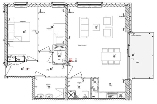 -Woonkamer met open keuken (in hoekopstelling) voorzien van diverse inbouwapparatuur waaronder koelkast, combi-magnetron, inductiekookplaat, afzuigkap en vaatwasser;